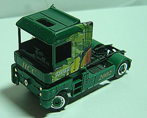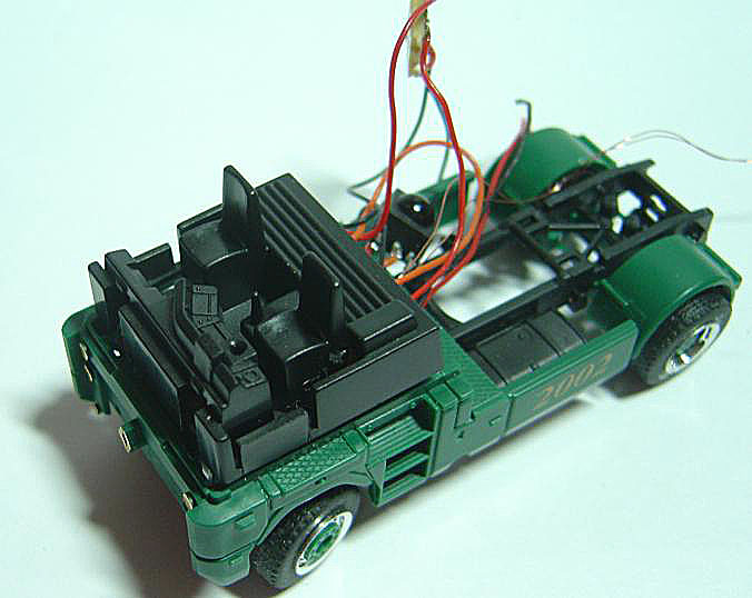 Nachdem ich ja schon eine Solozug maschine gebaut hatte mit FM, wollte ich mir noch eine auf IR Basis bauen. Natürlich gab es auch hier eine neue Herausforderung die ich mir stellte. Die Zugmaschine sollte eine Komplett Freies Führerhaus haben und desweiteren sollte auch von dem Antrieb nicht viel zu sehen sein. Als Servo verbaute ich ein Graupner XC 50 Empfänger war eine IR Platine von Georg K. Als Accu kam eine Lipo mit 80 mAh zum Einsatz. Die Vorderachse ist eine LKW Achse von Faller. Als Antrieb kam ein 6X10 mm Motor mit einem Getriebeuntersetzung von 1:144 zum einsatz. |
