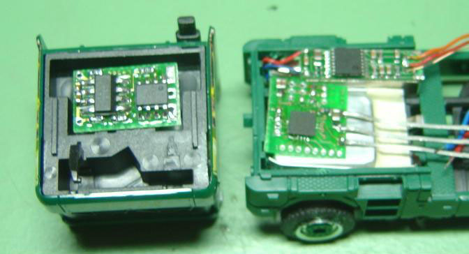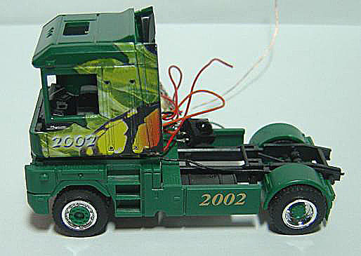 Nachdem ich ja schon eine Solozug maschine gebaut hatte mit FM, wollte ich mir noch eine auf IR Basis bauen. Natürlich gab es auch hier eine neue Herausforderung die ich mir stellte. Die Zugmaschine sollte eine Komplett Freies Führerhaus haben und desweiteren sollte auch von dem Antrieb nicht viel zu sehen sein. Als Servo verbaute ich ein Graupner XC 50 Empfänger war eine IR Platine von Georg K. Als Accu kam eine Lipo mit 80 mAh zum Einsatz. Die Vorderachse ist eine LKW Achse von Faller. Als Antrieb kam ein 6X10 mm Motor mit einem Getriebeuntersetzung von 1:144 zum einsatz. |